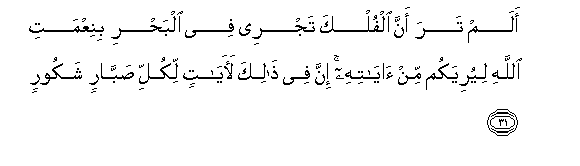 31. Alam tara anna alfulka tajree fee albahri biniAAmati Allahi liyuriyakum min ayatihi inna fee thalika laayatin likulli sabbarin shakoorin