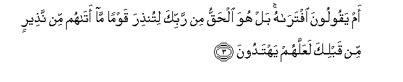 3. Am yaqooloona iftarahu bal huwa alhaqqu min rabbika litunthira qawman ma atahum min natheerin min qablika laAAallahum yahtadoona