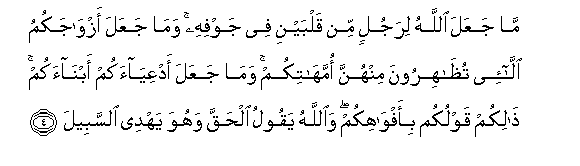 4. Ma jaAAala Allahu lirajulin min qalbayni fee jawfihi wama jaAAala azwajakumu alla-ee tuthahiroona minhunna ommahatikum wama jaAAala adAAiyaakum abnaakum thalikum qawlukum bi-afwahikum waAllahu yaqoolu alhaqqa wahuwa yahdee alssabeela