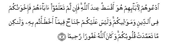 5. OdAAoohum li-aba-ihim huwa aqsatu AAinda Allahi fa-in lam taAAlamoo abaahum fa-ikhwanukum fee alddeeni wamawaleekum walaysa AAalaykum junahun feema akhta/tum bihi walakin ma taAAammadat quloobukum wakana Allahu ghafooran raheeman