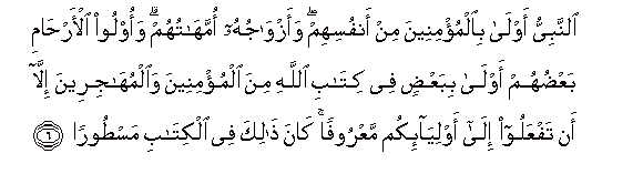 6. Alnnabiyyu awla bialmu/mineena min anfusihim waazwajuhu ommahatuhum waoloo al-arhami baAAduhum awla bibaAAdin fee kitabi Allahi mina almu/mineena waalmuhajireena illa an tafAAaloo ila awliya-ikum maAAroofan kana thalika fee alkitabi mastooran