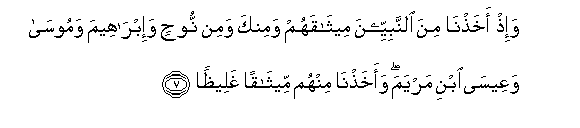 7. Wa-ith akhathna mina alnnabiyyeena meethaqahum waminka wamin noohin wa-ibraheema wamoosa waAAeesa ibni maryama waakhathna minhum meethaqan ghaleethan