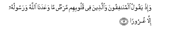 12. And behold! The Hypocrites and those in whose hearts is a disease (even) say: "(Allah) and His Messenger promised us nothing but delusion!"