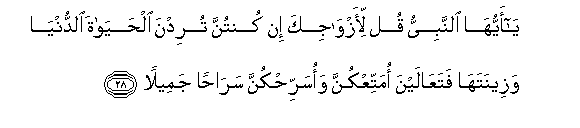 28. Ya ayyuha alnnabiyyu qul li-azwajika in kuntunna turidna alhayata alddunya wazeenataha fataAAalayna omattiAAkunna waosarrihkunna sarahan jameelan