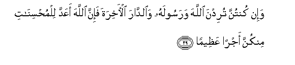 29. Wa-in kuntunna turidna Allaha warasoolahu waalddara al-akhirata fa-inna Allaha aAAadda lilmuhsinati minkunna ajran AAatheeman