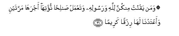 31. Waman yaqnut minkunna lillahi warasoolihi wataAAmal salihan nu/tiha ajraha marratayni waaAAtadna laha rizqan kareeman