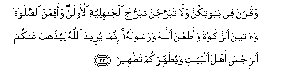 33. Waqarna fee buyootikunna wala tabarrajna tabarruja aljahiliyyati al-oola waaqimna alssalata waateena alzzakata waatiAAna Allaha warasoolahu innama yureedu Allahu liyuthhiba AAankumu alrrijsa ahla albayti wayutahhirakum tatheeran