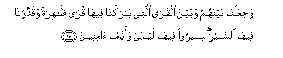 18. Between them and the Cities on which We had poured our blessings, We had placed Cities in prominent positions, and between them We had appointed stages of journey in due proportion: "Travel therein, secure, by night and by day."