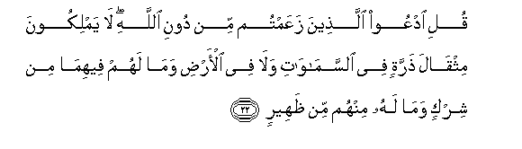 22. Say: "Call upon other (gods) whom ye fancy, besides Allah. They have no power,- not the weight of an atom,- in the heavens or on earth: No (sort of) share have they therein, nor is any of them a helper to Allah.