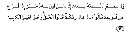 23. Wala tanfaAAu alshshafaAAatu AAindahu illa liman athina lahu hatta itha fuzziAAa AAan quloobihim qaloo matha qala rabbukum qaloo alhaqqa wahuwa alAAaliyyu alkabeeru