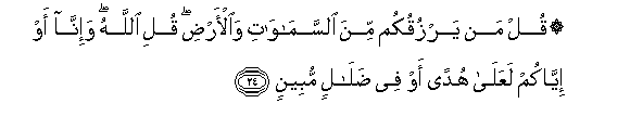 24. Qul man yarzuqukum mina alssamawati waal-ardi quli Allahu wa-inna aw iyyakum laAAala hudan aw fee dalalin mubeenin