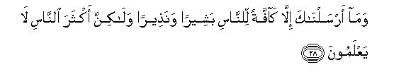 28. Wama arsalnaka illa kaffatan lilnnasi basheeran wanatheeran walakinna akthara alnnasi la yaAAlamoona