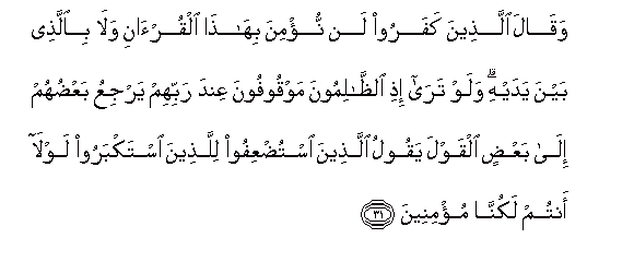 31. Waqala allatheena kafaroo lan nu/mina bihatha alqur-ani wala biallathee bayna yadayhi walaw tara ithi alththalimoona mawqoofoona AAinda rabbihim yarjiAAu baAAduhum ila baAAdin alqawla yaqoolu allatheena istudAAifoo lillatheena istakbaroo lawla antum lakunna mu/mineena