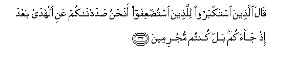 32. Qala allatheena istakbaroo lillatheena istudAAifoo anahnu sadadnakum AAani alhuda baAAda ith jaakum bal kuntum mujrimeena