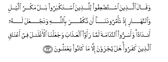 33. Waqala allatheena istudAAifoo lillatheena istakbaroo bal makru allayli waalnnahari ith ta/muroonana an nakfura biAllahi wanajAAala lahu andadan waasarroo alnnadamata lamma raawoo alAAathaba wajaAAalna al-aghlala fee aAAnaqi allatheena kafaroo hal yujzawna illa ma kanoo yaAAmaloona