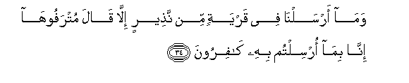 34. Wama arsalna fee qaryatin min natheerin illa qala mutrafooha inna bima orsiltum bihi kafiroona