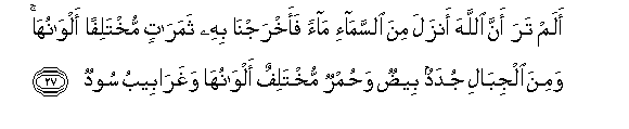 27. Alam tara anna Allaha anzala mina alssama-i maan faakhrajna bihi thamaratin mukhtalifan alwanuha wamina aljibali judadun beedun wahumrun mukhtalifun alwanuha wagharabeebu soodun