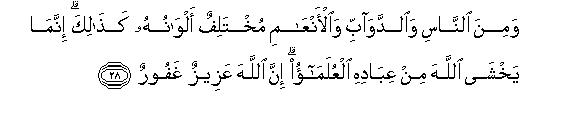 28. Wamina alnnasi waalddawabbi waal-anAAami mukhtalifun alwanuhu kathalika innama yakhsha Allaha min AAibadihi alAAulamao inna Allaha AAazeezun ghafoorun