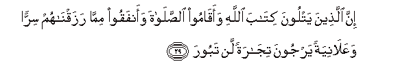 29. Inna allatheena yatloona kitaba Allahi waaqamoo alssalata waanfaqoo mimma razaqnahum sirran waAAalaniyatan yarjoona tijaratan lan taboora