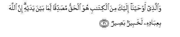 31. Waallathee awhayna ilayka mina alkitabi huwa alhaqqu musaddiqan lima bayna yadayhi inna Allaha biAAibadihi lakhabeerun baseerun