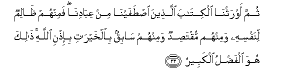 32. Thumma awrathna alkitaba allatheena istafayna min AAibadina faminhum thalimun linafsihi waminhum muqtasidun waminhum sabiqun bialkhayrati bi-ithni Allahi thalika huwa alfadlu alkabeeru