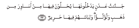 33. Jannatu AAadnin yadkhuloonaha yuhallawna feeha min asawira min thahabin walu/lu-an walibasuhum feeha hareerun