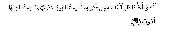 35. Allathee ahallana dara almuqamati min fadlihi la yamassuna feeha nasabun wala yamassuna feeha lughoobun