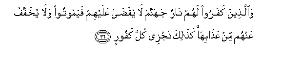 36. Waallatheena kafaroo lahum naru jahannama la yuqda AAalayhim fayamootoo wala yukhaffafu AAanhum min AAathabiha kathalika najzee kulla kafoorin