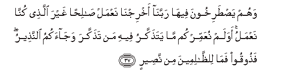 37. Wahum yastarikhoona feeha rabbana akhrijna naAAmal salihan ghayra allathee kunna naAAmalu awa lam nuAAammirkum ma yatathakkaru feehi man tathakkara wajaakumu alnnatheeru fathooqoo fama lilththalimeena min naseerin