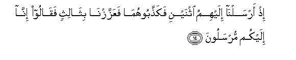 14. Ith arsalna ilayhimu ithnayni fakaththaboohuma faAAazzazna bithalithin faqaloo inna ilaykum mursaloona