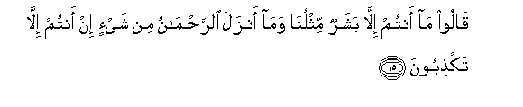 15. The (people) said: "Ye are only men like ourselves; and ((Allah)) Most Gracious sends no sort of revelation: ye do nothing but lie."