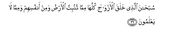 36. Subhana allathee khalaqa al-azwaja kullaha mimma tunbitu al-ardu wamin anfusihim wamimma la yaAAlamoona