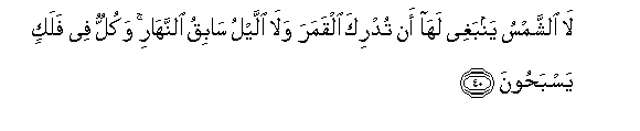 40. La alshshamsu yanbaghee laha an tudrika alqamara wala allaylu sabiqu alnnahari wakullun fee falakin yasbahoona
