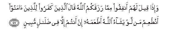 47. Wa-itha qeela lahum anfiqoo mimma razaqakumu Allahu qala allatheena kafaroo lillatheena amanoo anutAAimu man law yashao Allahu atAAamahu in antum illa fee dalalin mubeenin