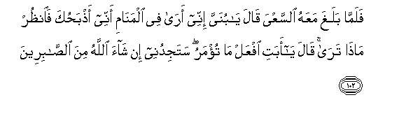 102. Falamma balagha maAAahu alssaAAya qala ya bunayya innee ara fee almanami annee athbahuka faonthur matha tara qala ya abati ifAAal ma tu/maru satajidunee in shaa Allahu mina alssabireena