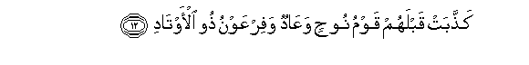12. Kaththabat qablahum qawmu noohin waAAadun wafirAAawnu thoo al-awtadi