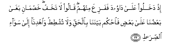 22. Ith dakhaloo AAala dawooda fafaziAAa minhum qaloo la takhaf khasmani bagha baAAduna AAala baAAdin faohkum baynana bialhaqqi wala tushtit waihdina ila sawa-i alssirati