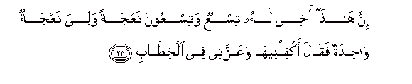 23. Inna hatha akhee lahu tisAAun watisAAoona naAAjatan waliya naAAjatun wahidatun faqala akfilneeha waAAazzanee fee alkhitabi