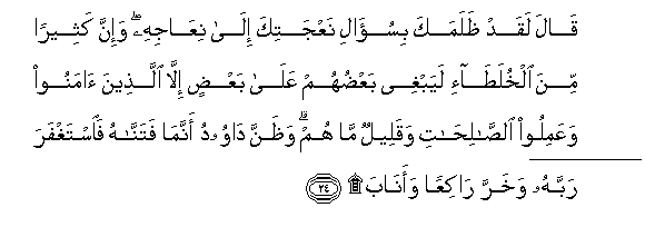 24. Qala laqad thalamaka bisu-ali naAAjatika ila niAAajihi wa-inna katheeran mina alkhulata-i layabghee baAAduhum AAala baAAdin illa allatheena amanoo waAAamiloo alssalihati waqaleelun ma hum wathanna dawoodu annama fatannahu faistaghfara rabbahu wakharra rakiAAan waanaba