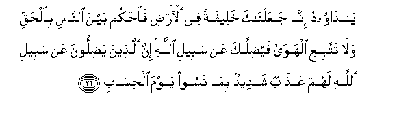 26. Ya dawoodu inna jaAAalnaka khaleefatan fee al-ardi faohkum bayna alnnasi bialhaqqi wala tattabiAAi alhawa fayudillaka AAan sabeeli Allahi inna allatheena yadilloona AAan sabeeli Allahi lahum AAathabun shadeedun bima nasoo yawma alhisabi