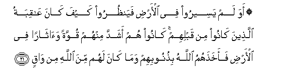 21. Awa lam yaseeroo fee al-ardi fayanthuroo kayfa kana AAaqibatu allatheena kanoo min qablihim kanoo hum ashadda minhum quwwatan waatharan fee al-ardi faakhathahumu Allahu bithunoobihim wama kana lahum mina Allahi min waqin