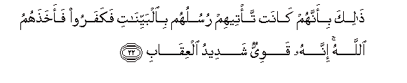 22. Thalika bi-annahum kanat ta/teehim rusuluhum bialbayyinati fakafaroo faakhathahumu Allahu innahu qawiyyun shadeedu alAAiqabi