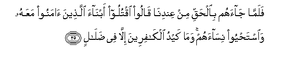 25. Falamma jaahum bialhaqqi min AAindina qaloo oqtuloo abnaa allatheena amanoo maAAahu waistahyoo nisaahum wama kaydu alkafireena illa fee dalalin