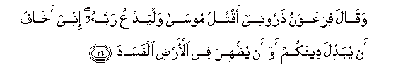 26. Waqala firAAawnu tharoonee aqtul moosa walyadAAu rabbahu innee akhafu an yubaddila deenakum aw an yuthhira fee al-ardi alfasada