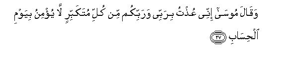 27. Moses said: "I have indeed called upon my Lord and your Lord (for protection) from every arrogant one who believes not in the Day of Account!"