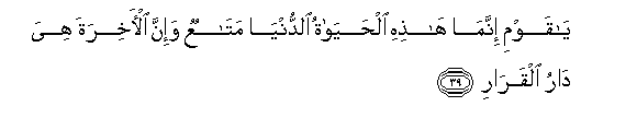 39. Ya qawmi innama hathihi alhayatu alddunya mataAAun wa-inna al-akhirata hiya daru alqarari