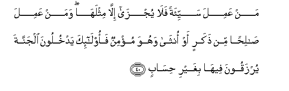 40. Man AAamila sayyi-atan fala yujza illa mithlaha waman AAamila salihan min thakarin aw ontha wahuwa mu/minun faola-ika yadkhuloona aljannata yurzaqoona feeha bighayri hisabin