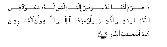 43. La jarama annama tadAAoonanee ilayhi laysa lahu daAAwatun fee alddunya wala fee al-akhirati waanna maraddana ila Allahi waanna almusrifeena hum as-habu alnnari