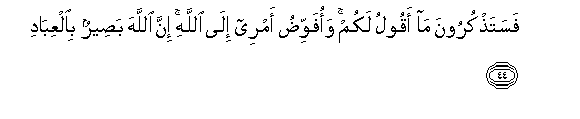 44. "Soon will ye remember what I say to you (now), My (own) affair I commit to Allah. for Allah (ever) watches over His Servants."