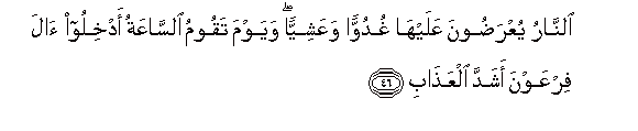 46. In front of the Fire will they be brought, morning and evening: And (the sentence will be) on the Day that Judgment will be established: "Cast ye the People of Pharaoh into the severest Penalty!"